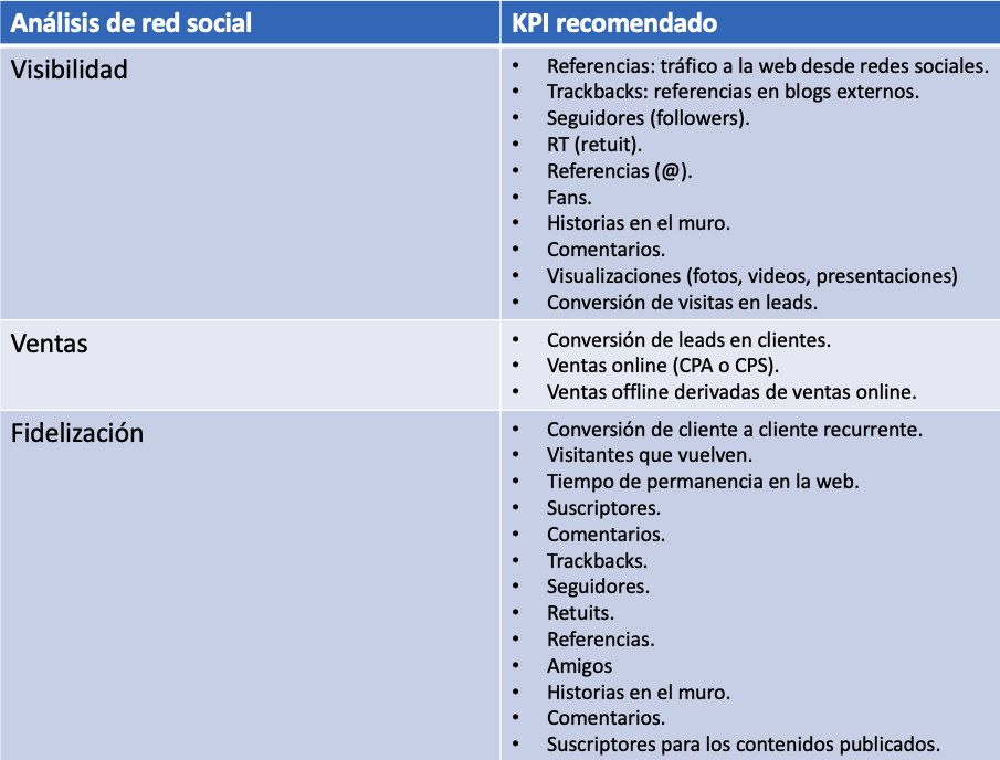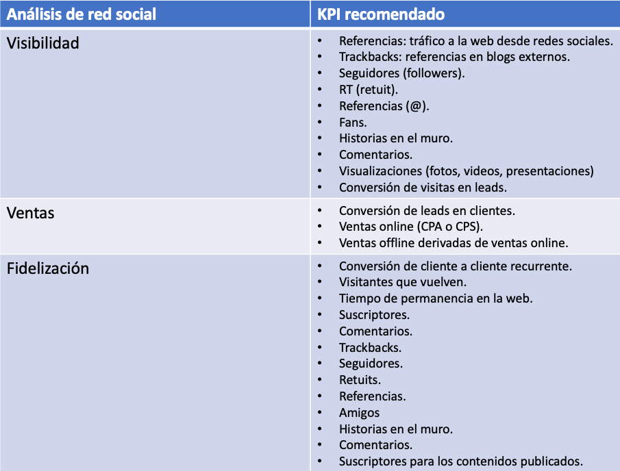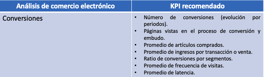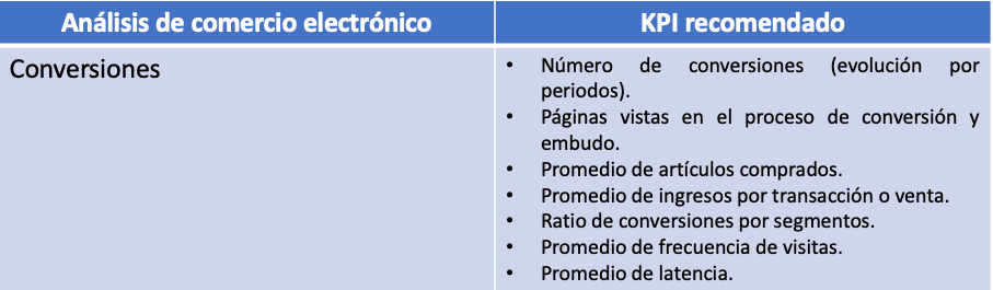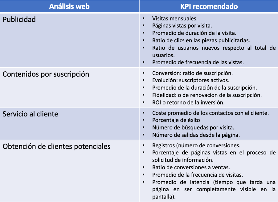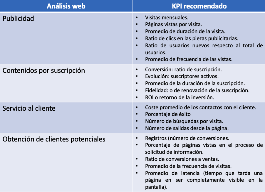 Podemos clasificar los KPI según nel tipo de análisis que vamos a realizar. Análisis web Análisis del comercio electrónico Análisis de la red social Siguiente tema sobre Analítica web: Dashboards Comparte esto: Haz clic para compartir en LinkedIn (Se abre en una ventana nueva) LinkedIn Haz clic para compartir en X (Se abre en una ventana nueva) X Haz clic para compartir en Facebook (Se abre en una ventana nueva) Facebook Haz clic para compartir en Pinterest (Se abre en una ventana nueva) Pinterest Haz clic para compartir en WhatsApp (Se abre en una ventana nueva) WhatsApp Haz clic para imprimir (Se abre en una ventana nueva) Imprimir Haz clic para enviar un enlace por correo electrónico a un amigo (Se abre en una ventana nueva) Correo electrónico Me gusta Cargando...
