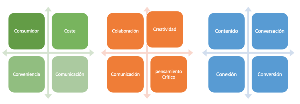 Las 4C hacen referencia a Consumidor, Coste, Conveniencia y Comunicación, pero también a Colaboración, Creatividad, Comunicación y Pensamiento Crítico, o a Contenido, Conversación, Conexión y Conversión.