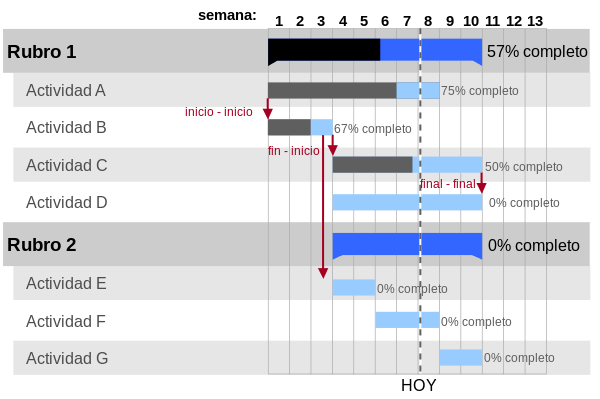 Permite representar gráficamente las diferentes fases, tareas y actividades programadas dentro de una línea de tiempo. En el eje vertical se introducen las diferentes actividades que se tienen que ejecutar y en el eje horizontal se muestra el calendario con la duración de cada una de ellas.